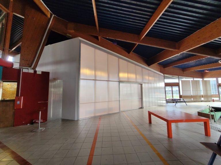 Une structure réalisée en bois et parois en polycarbonate. Pour la société MPI Action, scénographie Plan Común.